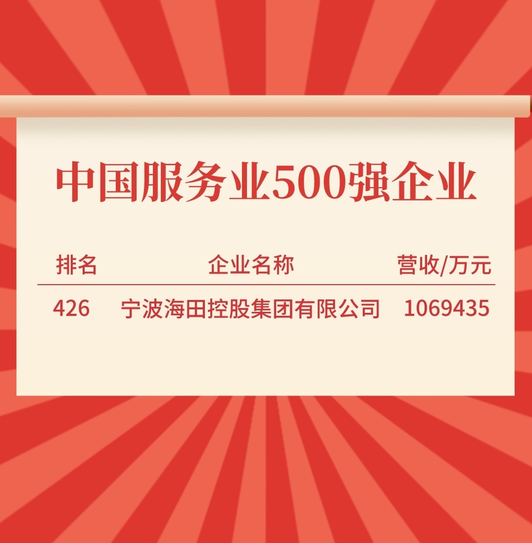 其中,寧波海田控股集團以2022年營(yíng)業(yè)收入1069435萬(wàn)元的成績(jì)獲得中國服務(wù)業(yè)500強企業(yè)第426位,充分展現近年來(lái)公司在經(jīng)營(yíng)管理、業(yè)務(wù)發(fā)展等方面所取得的成績(jì),海田品牌知名度和社會(huì )影響力進(jìn)一步提升。